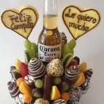 Arreglo comestible con frutillas, uvas, masmelos acompañada de una cerveza CORONA. Puedes personalizar la frase en los corazones. “Feliz día, Te amo, Te Quiero, Recuperate, etc…