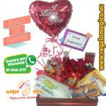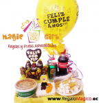 Un detalle lleno de mucho cariño, chocolates, golosinas, afiche de fomix y globo.