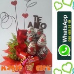 Un diseño de amor con rosas y frutillas achocolatadas con frase