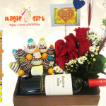 Un detalle de amor de vino, rosas y frutillas achocolatadas en base de madera