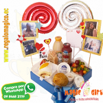 Bandeja con sanduche mixto, jugo de mora, leche chocolatada, galletas ritz, inacake relleno, mini tostadas, mini arreglo de frutillas achocolatadas acompañados de un globo de aluminio acorde al motivo. Cubierto de celofán, lazo y tarjeta impresa.