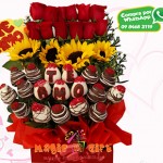 Girasoles, rosas y frutillas con unas barras de chocolate y globo de helio para tu ocasión.