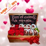 un cofre de madera con frase personalizada, rosas y frutillas achocolatadas.