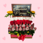 una caja de madera con frase personalizada, rosas y frutillas achocolatadas