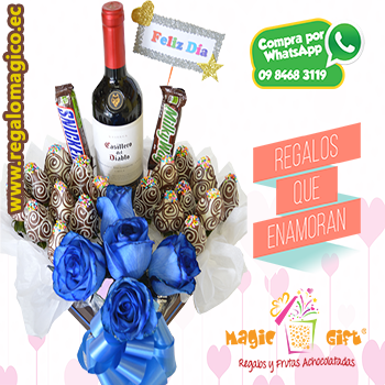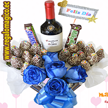Un detalle en color azul, Vino concha y toros, chocolates, frutillas achocolatadas y unas rosas azules para completar el regalo.