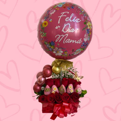 Una hermosa Canasta decorada con globos con frutillas Achocolatadas y vibrantes rosas rojas