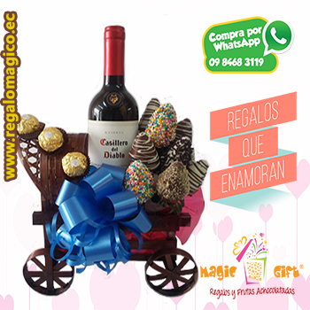 Una carreta con un vino concha y toro, chocolates ferrero y frutillas achocolatadas. Dulcemente decorado