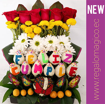 Un regalo de cumpleaños de flores y frutas achocolatadas