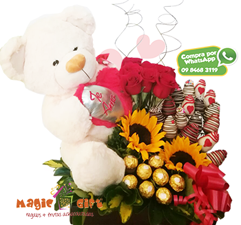 Un detalle de amor de rosas, frutillas, peluche y chocolates ferrero rocher