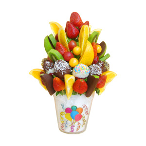 Base de cristal decorado con 24 frutillas, 16 rodajas de naranja americana, 8 rodajas de manzana achocolatada, 4 rodajas de kiwy, 12 uvas y 12 uvillas.