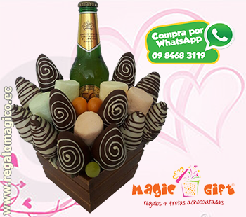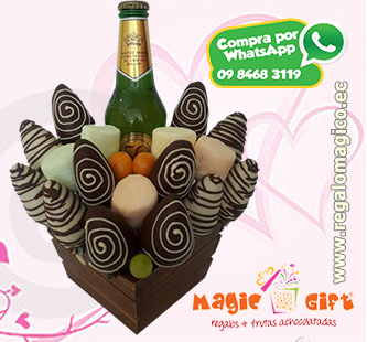 Un delicioso regalo de frutas achocolatadas, masmelos y una rica cerveza club