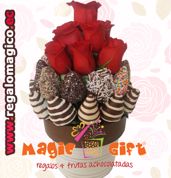 Rosas rojas y ricas frutillas achocolatadas en cerámica. modelo redondo!