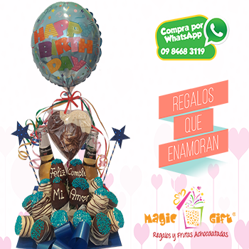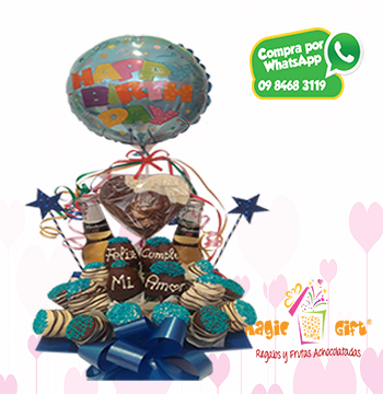 Un regalo para caballero en un dia muy especial, 2 cervezas, frutillas y masmelos achocolatados. Incluye globo.